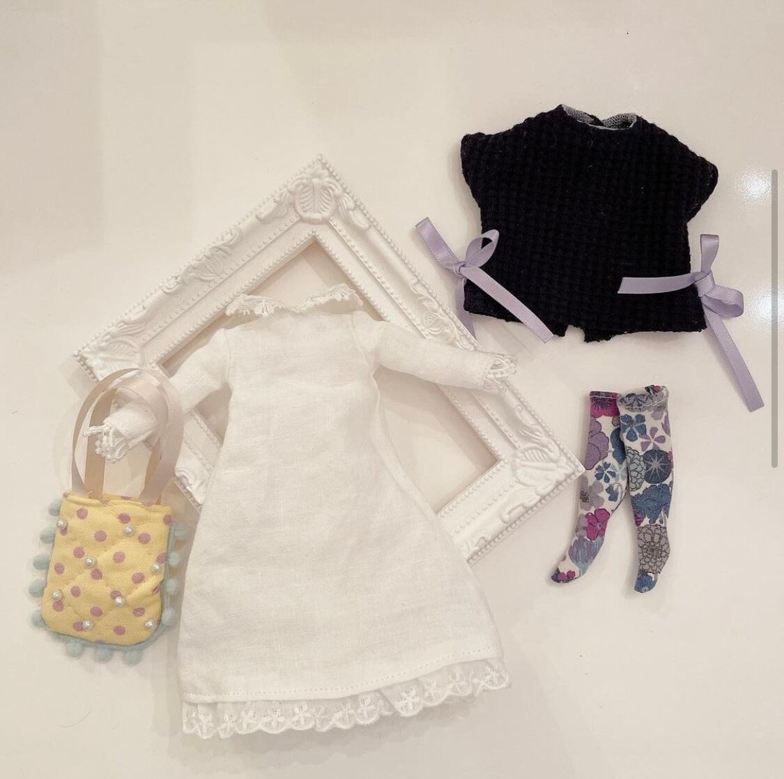 麻100%の真っ白なワンピース、ネイビーのオーバーサイズトップス、膝下の花柄ソックス、パール付きキルティングバッグの4点セットです
