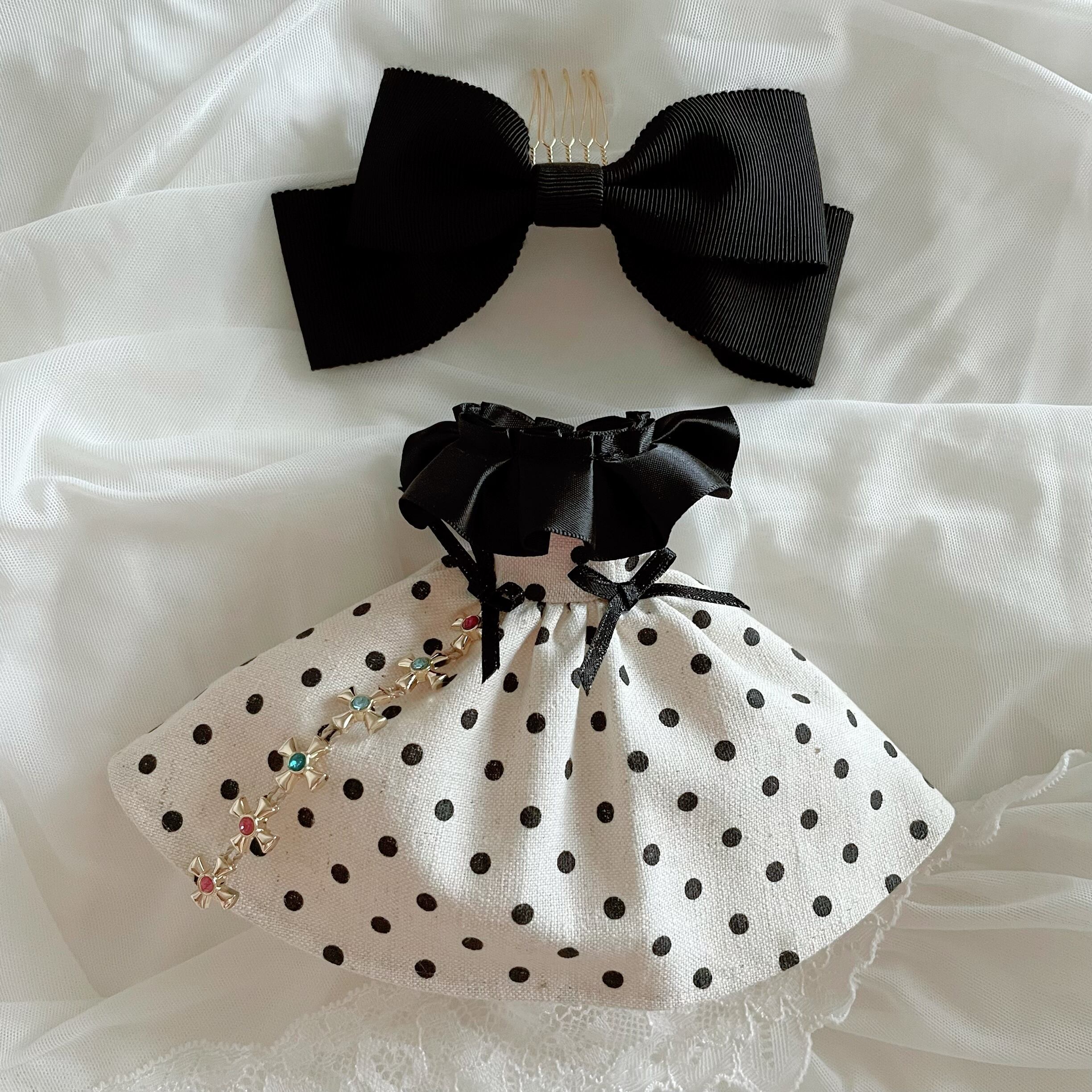 ふんわり広がるスカートにキラキラと輝くジュエリーがエレガントな水玉のワンピースとヘッドリボンの2点をセットにしました